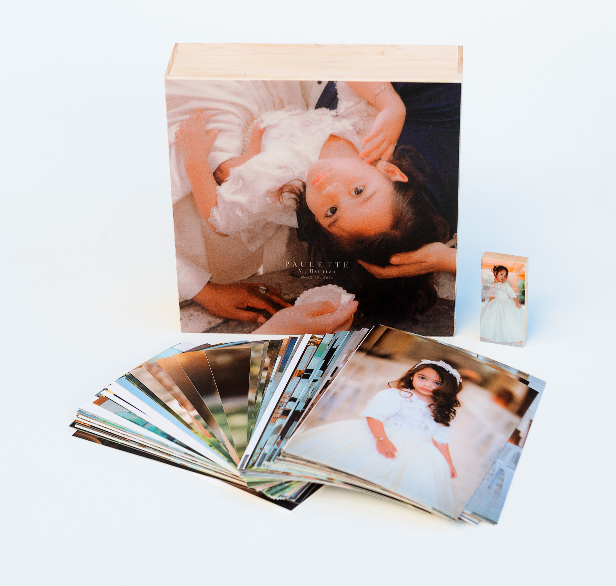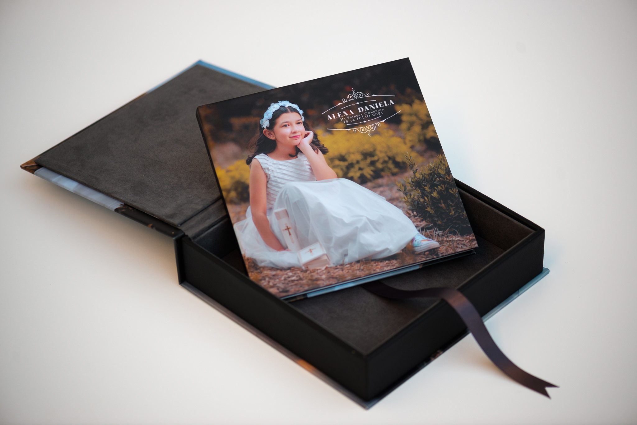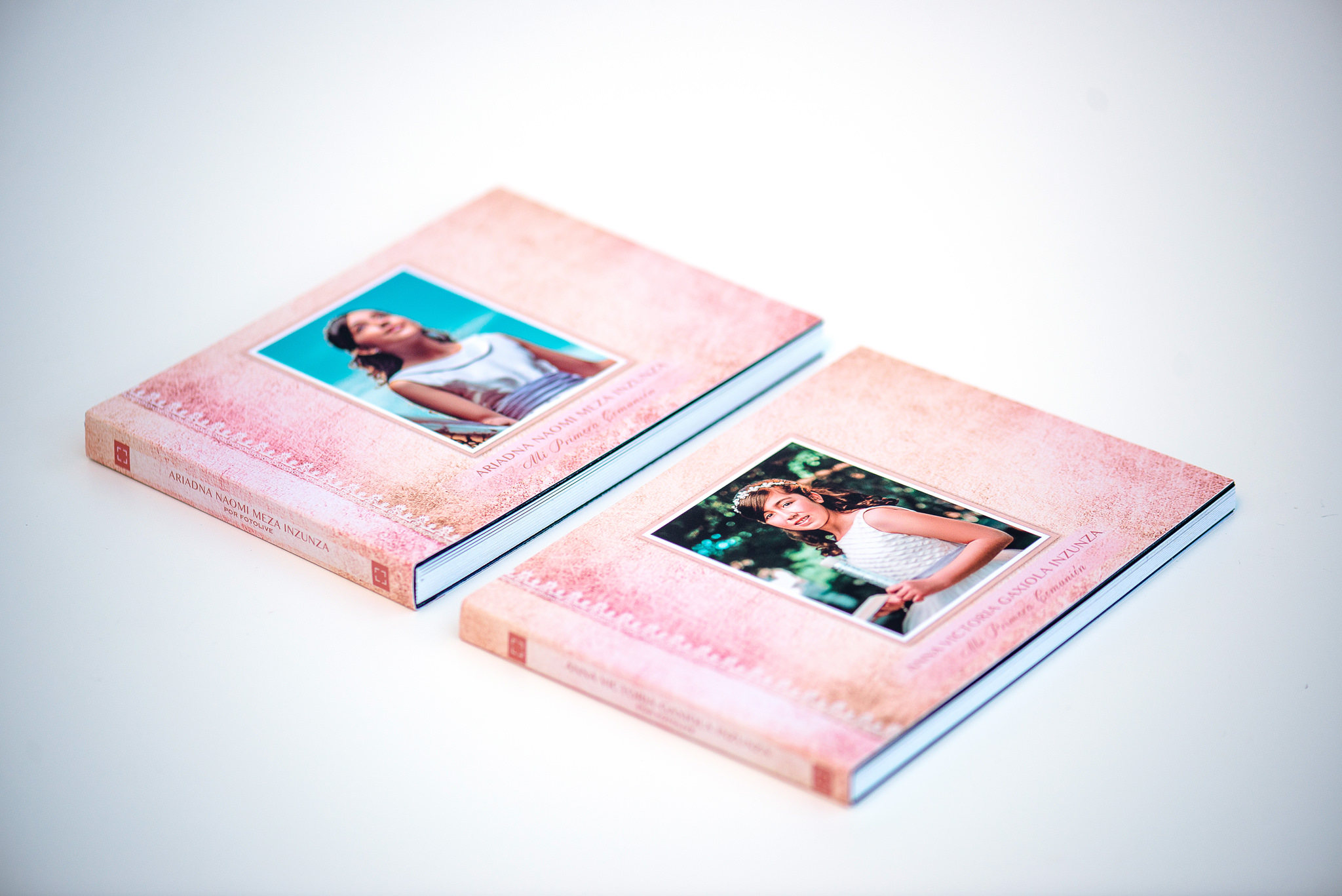 - Primera comunión o Bautizo: Un álbum más compacto y ligero, con una encuadernación de pasta dura impresa, es ideal para documentar tus eventos importantes sin que este compita en tamaño y presencia con álbumes de otros eventos de mayor envergadura como lo puede ser una Boda.